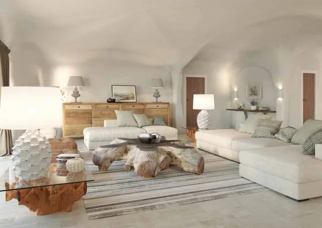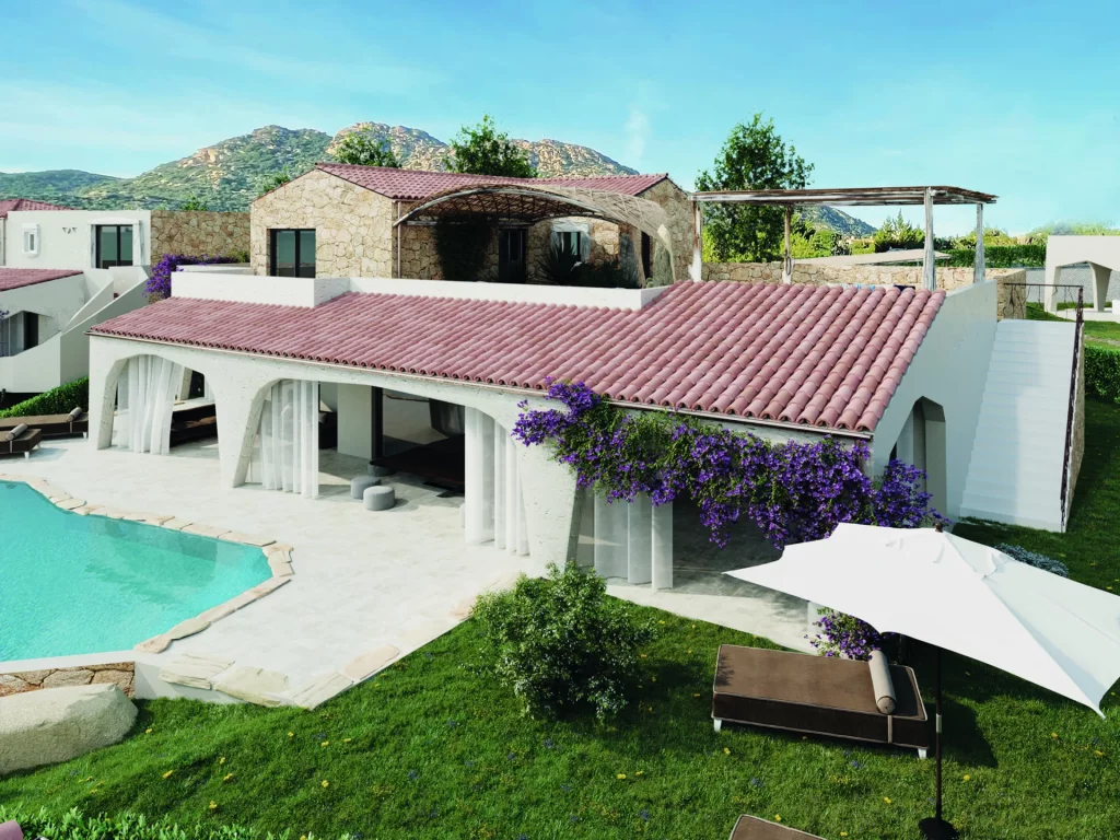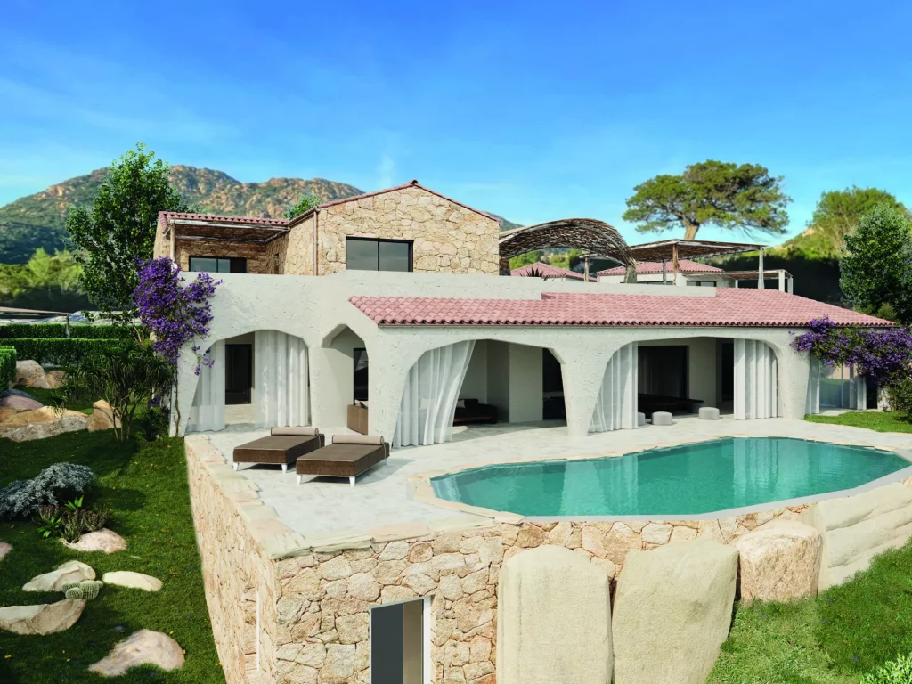 Der Wohnbereich der VILLA ist hell und großzügig gestaltet und öffnet sich zu einer großen Terrasse, die einen **atemberaubenden Blick auf die Bucht von Cala di Volpe** bietet. Der Innenbereich fließt harmonisch in den Außenbereich über, wo eine wunderschön gestaltete Poollandschaft auf Sie wartet. Der **große Swimmingpool** ist das Herzstück des Gartens und bietet eine erfrischende Oase mit Panoramablick auf das türkisfarbene Wasser des Mittelmeers. Umgeben von gepflegten Grünflächen, Sonnenliegen und einem überdachten Lounge-Bereich, lädt dieser Bereich zu unvergesslichen Tagen und entspannten Abenden ein.