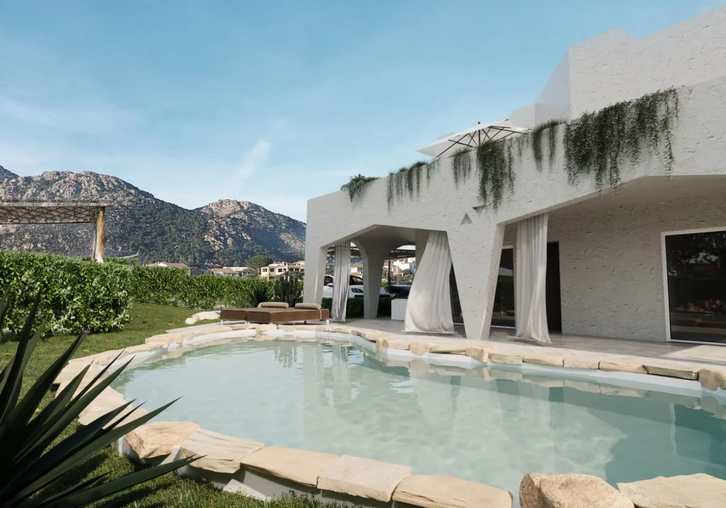 All'esterno, la VILLA è circondata da un **ampio giardino privato** che ospita una piscina moderna e raffinata. La piscina, con il suo design contemporaneo e le sue linee essenziali, è perfetta per rilassarsi e ammirare il paesaggio unico della Costa Smeralda. Intorno alla piscina, comodi lettini e un’area lounge all’aperto invitano a godere del sole sardo e a vivere appieno l'esperienza mediterranea.