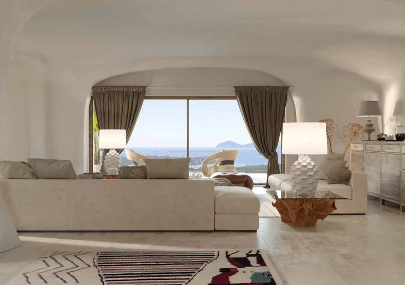 Il cuore della VILLA è rappresentato dalla zona giorno, un ambiente aperto e versatile, che si affaccia direttamente sulla terrazza esterna. Il soggiorno, con ampie vetrate scorrevoli, consente di godere di una splendida **vista sulla Cala di Volpe** e crea una continuità tra l'interno e l'esterno, rendendo l'intero spazio perfetto per momenti di convivialità o per trascorrere serate in assoluto relax.