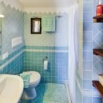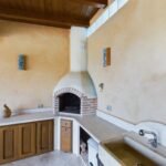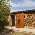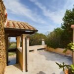 The villa, in classic Sardinian style, sits majestically atop a gentle hill, offering an unobstructed view of the deep blue sea. It is built from traditional natural materials, featuring warm stone walls and a characteristic terracotta roof that blends perfectly with the Mediterranean surroundings. The architecture follows clean, harmonious lines, with arches and handcrafted details adorning the façade.